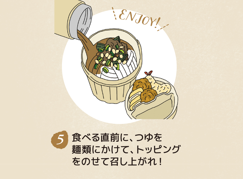 5 食べる直前に、つゆを麺類にかけて、トッピングをのせて召し上がれ!