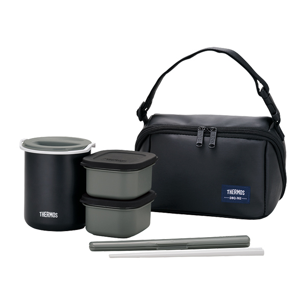 ごはんを保温、おかずは常温でセットで持ち運べるお弁当箱。各容器・フタ・ハシ・ハシケースは食洗機対応。