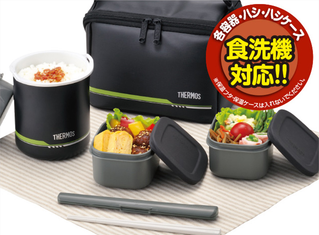 あたたかいごはんを魔法びんで保温、いたみやすいおかずは常温のままセットで持ち運べる、お弁当箱です。コンパクト設計の保温ケースによってお弁当箱サイズを実現した保温弁当箱。各容器・フタ・ハシ・ハシケースは食洗機対応です。