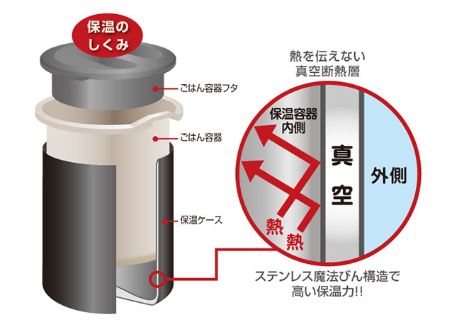 ごはんを温かく保温するケースは真空断熱構造で高い保温力です。