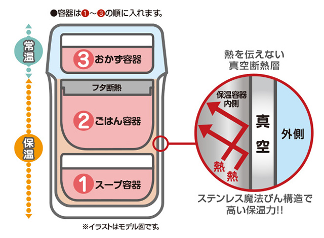 ごはんとスープはあたたかく保温、いたみやすいおかずは常温でキープ。