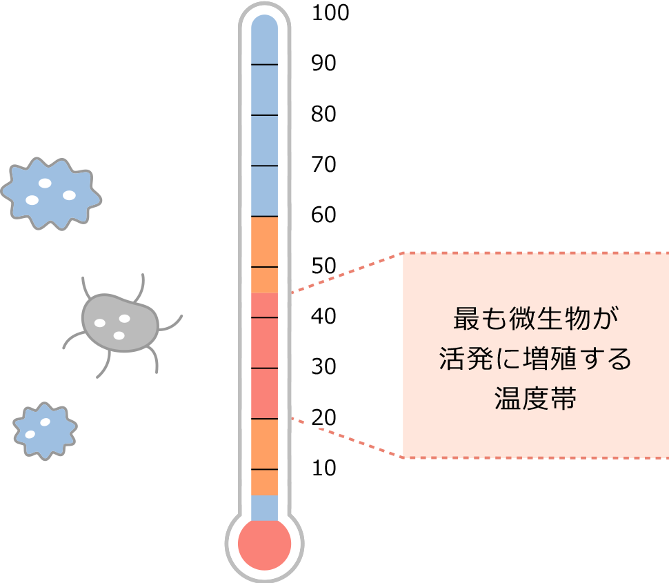 微生物は特殊な細菌を除き、20℃〜45℃、特に35℃前後でもっとも活発に増殖します。