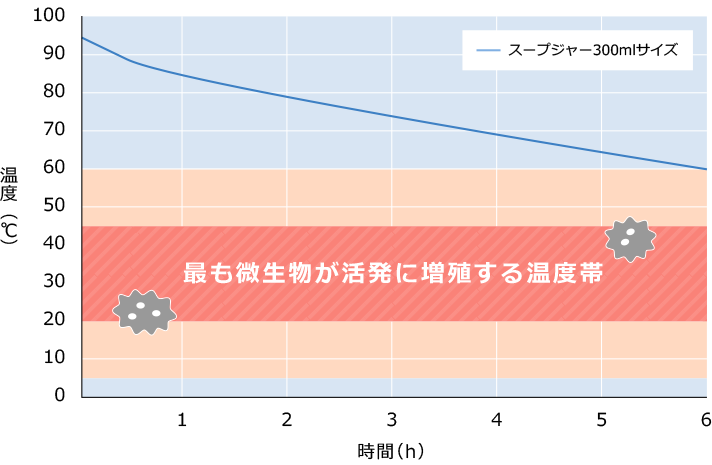 例えば、このグラフは300mlサイズのスープジャー(JBT)に95℃の熱湯を入れて保温した場合の温度変化です。