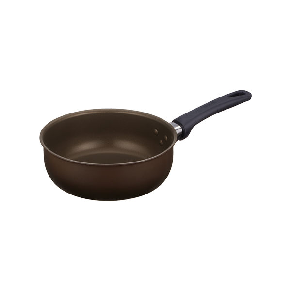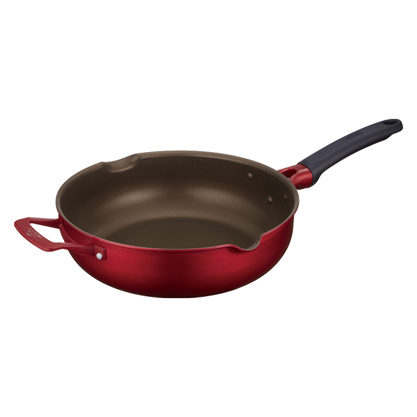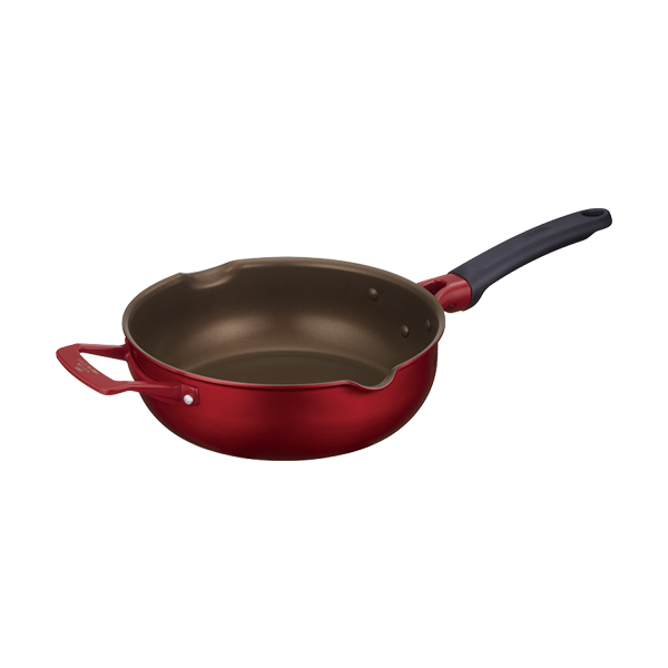 IHで使える補助取っ手付きの超深型フライパン!大小2種の注ぎ口が付いていて調理がしやすい。4サイズ展開。