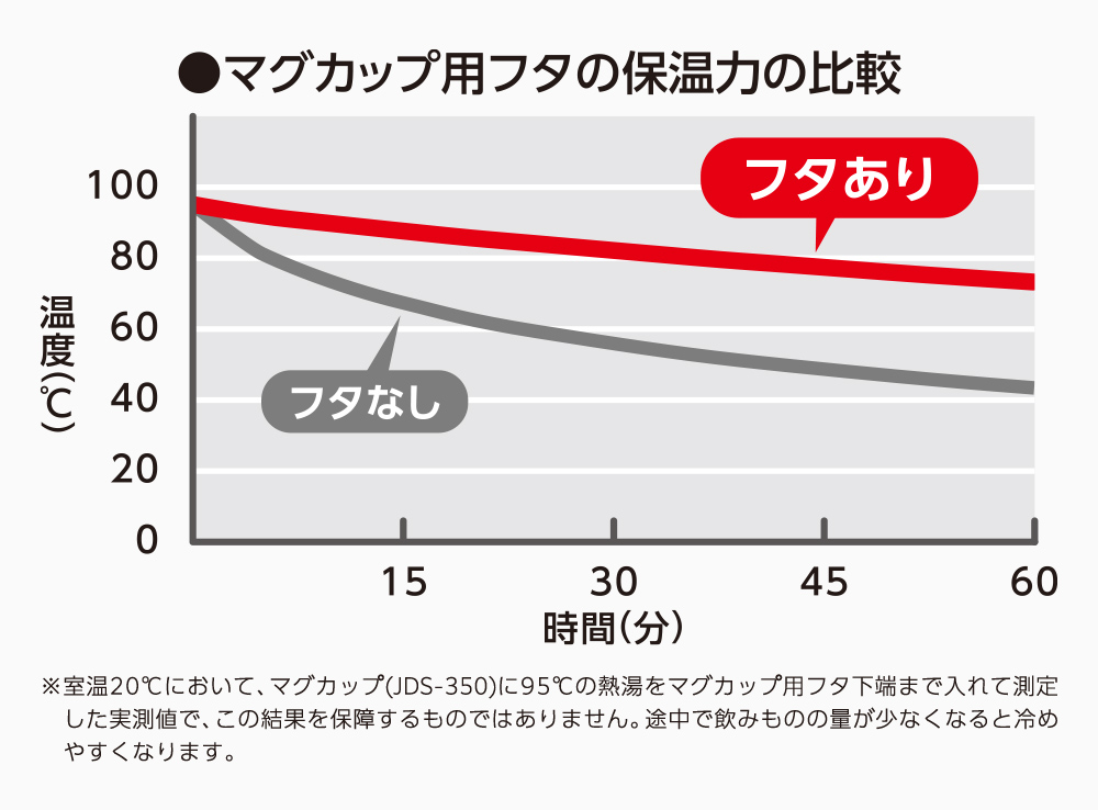フタををすると保温機能がアップします。(グラフはAHA-001LD(M)を使用した場合)