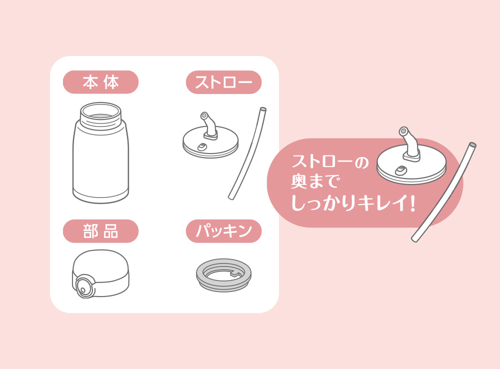 すべてのパーツに使えます。家族みんなのマグ・ボトルにも。