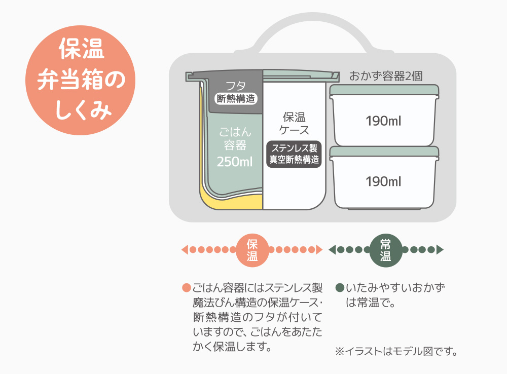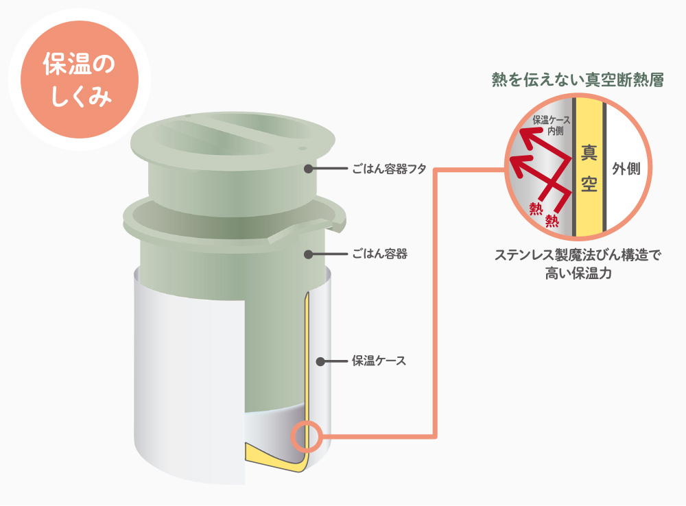 ごはん容器は真空断熱層であたたかく保温、いたみやすいおかずは常温で。
