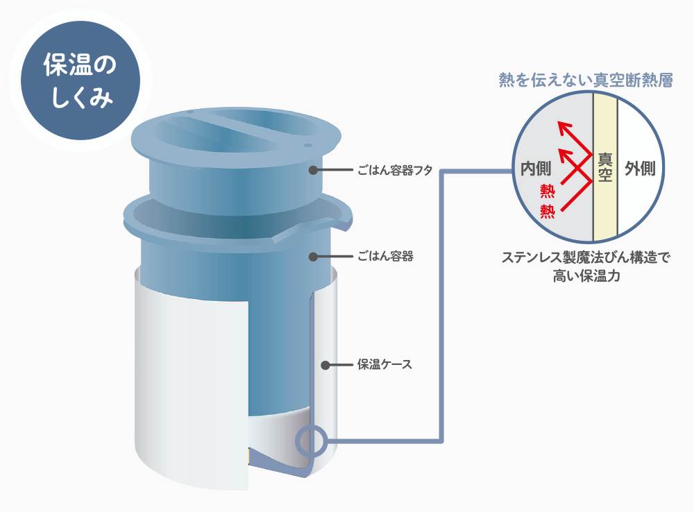 ごはんを温かく保温するケースは真空断熱構造で高い保温力です。
