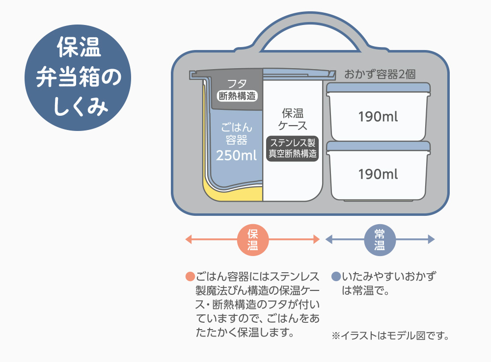 ごはん容器は真空断熱層であたたかく保温、いたみやすいおかずは常温で。