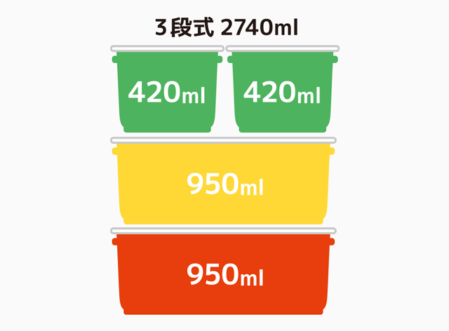 食べ終わった容器小と容器中は、容器大に収納できるのでコンパクトになります。