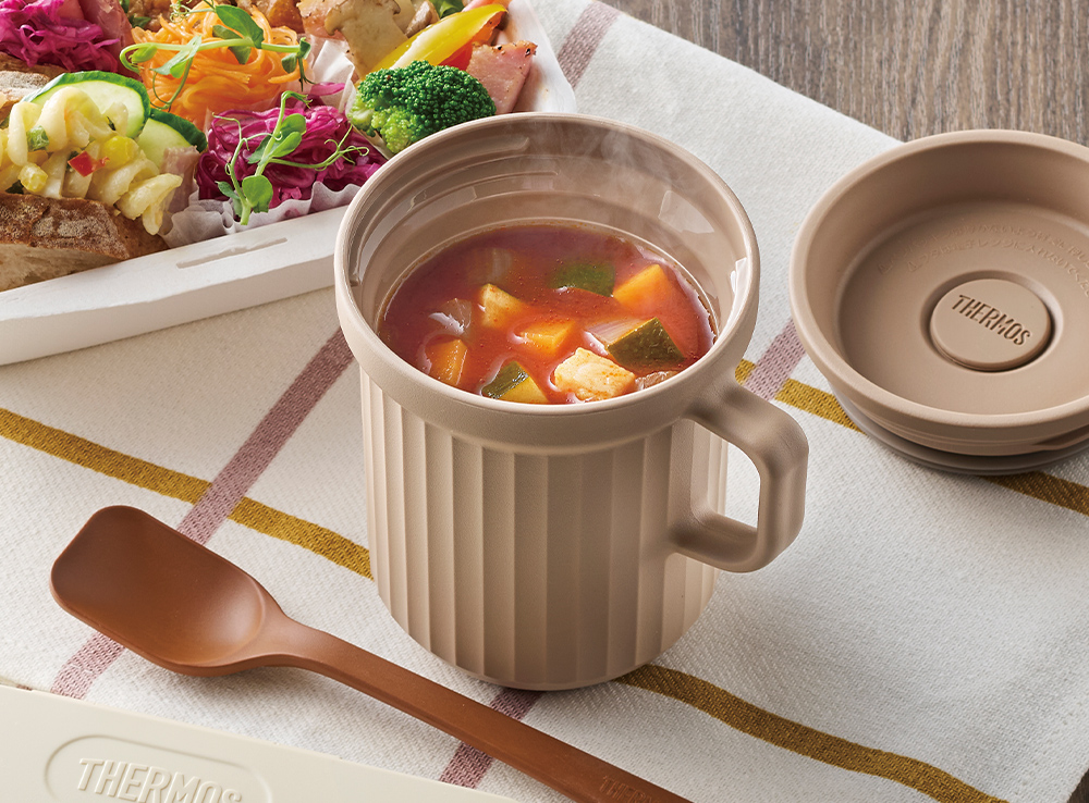 樹脂製で軽いスープマグ。電子レンジや冷蔵保存OK!(温めるときはフタをはずしてください。)