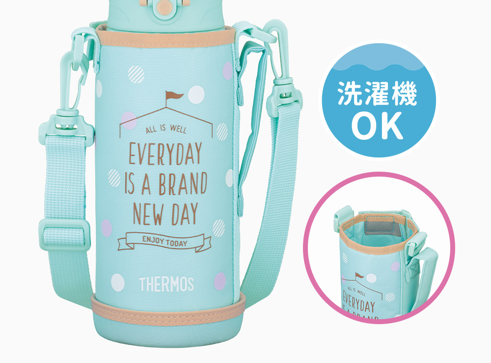 取り外しできるストラップ。洗濯機OK。コップを開けやすいすべり止め付き。