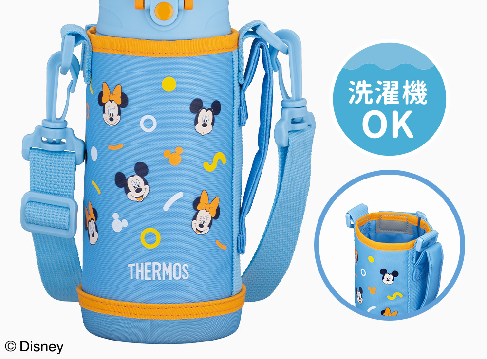 取り外しできるストラップ。洗濯機OK。コップを開けやすいすべり止め付き。