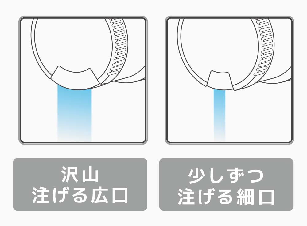 チタンの素材感を活かしたシンプルなデザインで軽量・コンパクト設計。用途にあわせて使い分けできる2つの注ぎ口のある中せん搭載。