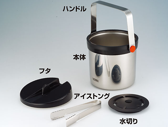 ステンレス魔法びん構造だから氷長持ち、結露もありません。水切りやトングつき。どんなインテリアにもフィットするステンレス素材は、丈夫で衛生的です。