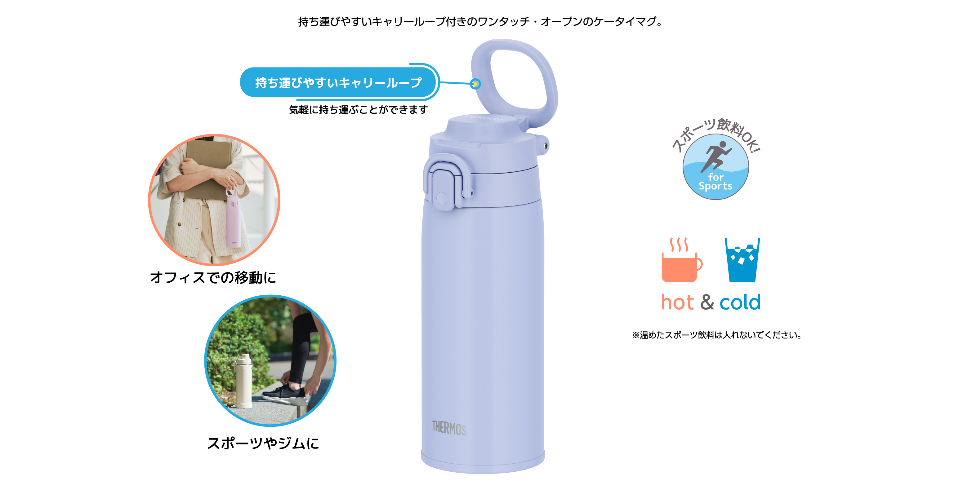 ●保冷効力とは、室温20℃±2℃において製品に4℃以下の水をせんユニット下端まで満たし、水温が4℃±1℃のときからせんユニットを付けて縦置きにした状態で6時間放置した場合におけるその水の温度です。