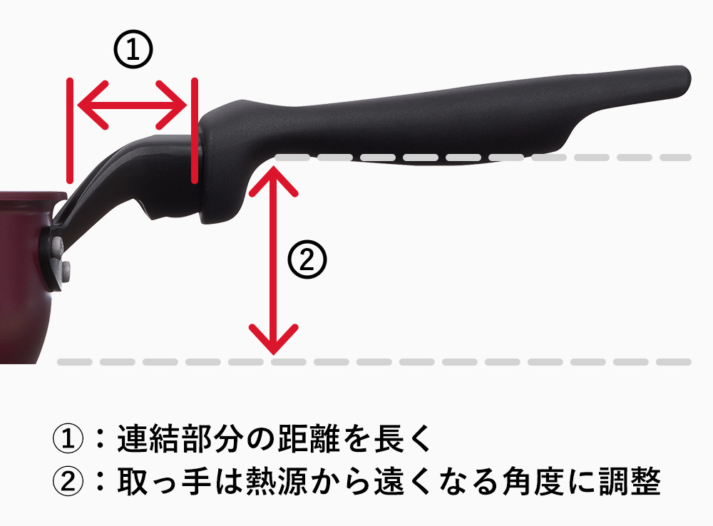 握りやすいハンドルは、取っ手を熱源から遠ざける設計。より安心して使えます。
