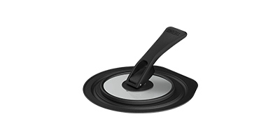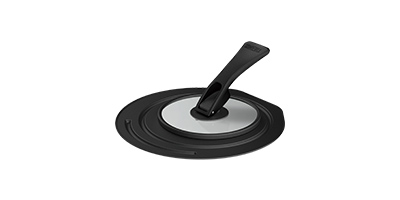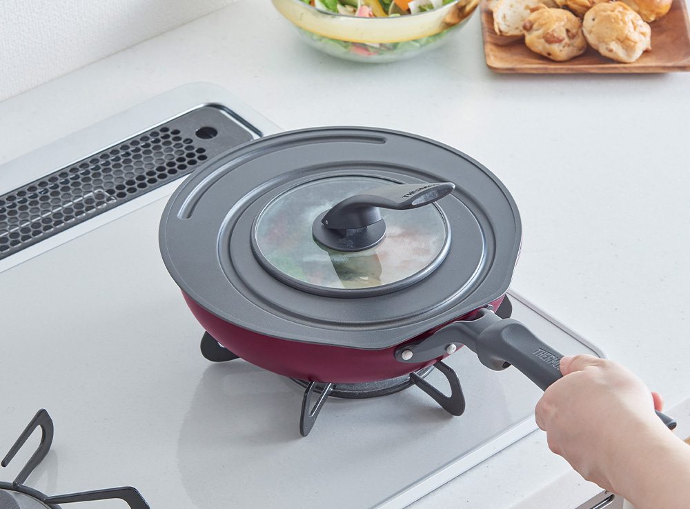 サーモス製フライパン・鍋・炒め鍋に使える自立式のフライパンフタ。折りたためるハンドルで収納にも便利。料理が見えるガラス窓つき。