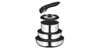 IH・ガス火両方OK!ベーシックなフライパン2点・鍋1点に鍋用のフタとハンドルが付いた5点セット。ミラー仕上げのデザインと、耐摩耗性の高さ、焦げつきにくさが特長です。