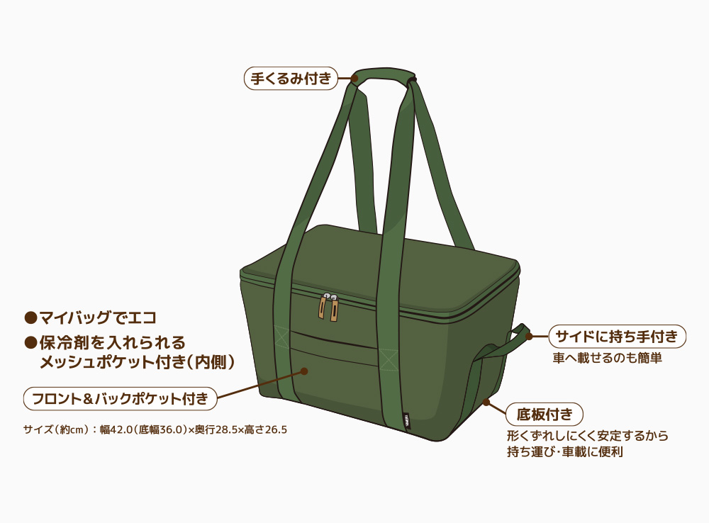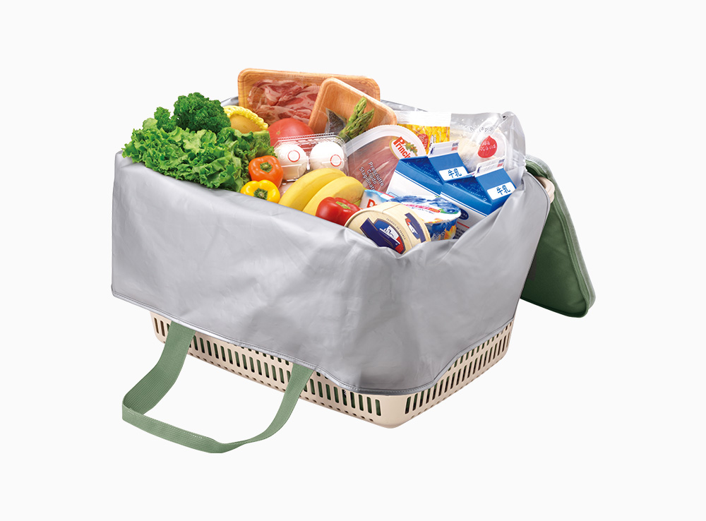 容量約25L、買い物カゴ用バッグ。牛乳パックの場合15本、2Lペットボトルの場合6本が入ります。