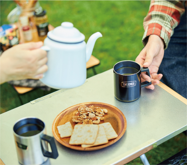 すぐそばで手に取れるマグカップ。 アウトドアだからこそ感じるいつもの便利さ。