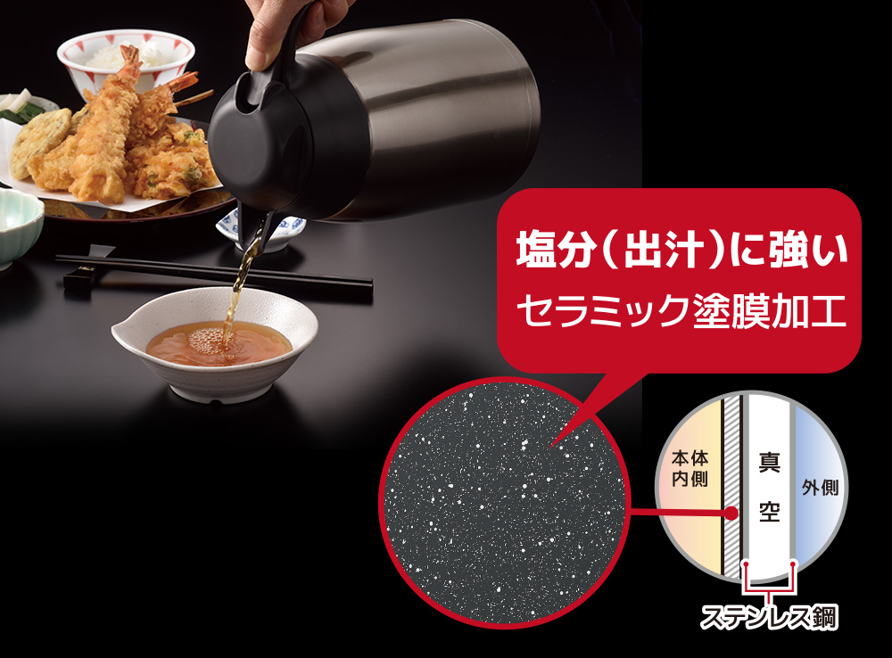 内面セラミック塗膜加工により、塩分に強く、出汁やスープなどいろいろなメニューに使えます。