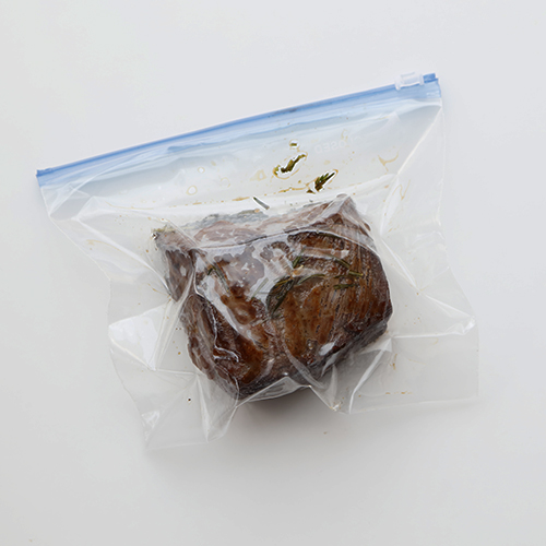 焼き色が付いたら火を止めて、ジッパーつきのポリ袋に牛肉とローズマリーを入れ、空気を抜きながら口をしっかり閉じる。