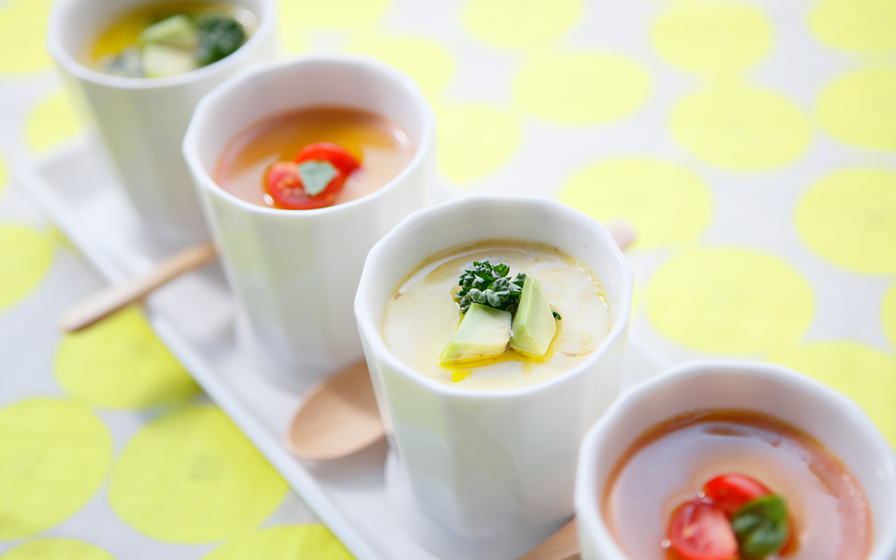 所定の時間が経過したら器を取り出す。アボカド茶碗蒸しにアボカドをトッピングして、オリーブオイルをかけパセリを添える。トマト茶碗蒸しには、オリー ブオイルをかけてミニトマトとバジルを飾って出来上がり。どちらの茶碗蒸しも、黒こしょうも良く合いますのでお好みでどうぞ。