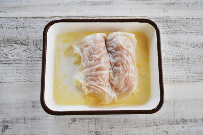 鶏肉は厚みを開いて厚さを均等にし、くるくると巻いてタコ糸で写真のように縛る。