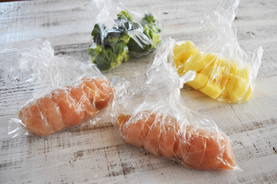 じゃがいもは2㎝大、ブロッコリーは小さめの小房に切り分ける。耐熱性の高いポリ袋に入れて水大さじ1を入れ、それぞれ空気を抜いてしっかり封をする。鶏肉も同様に袋に入れる(水はいれません)。