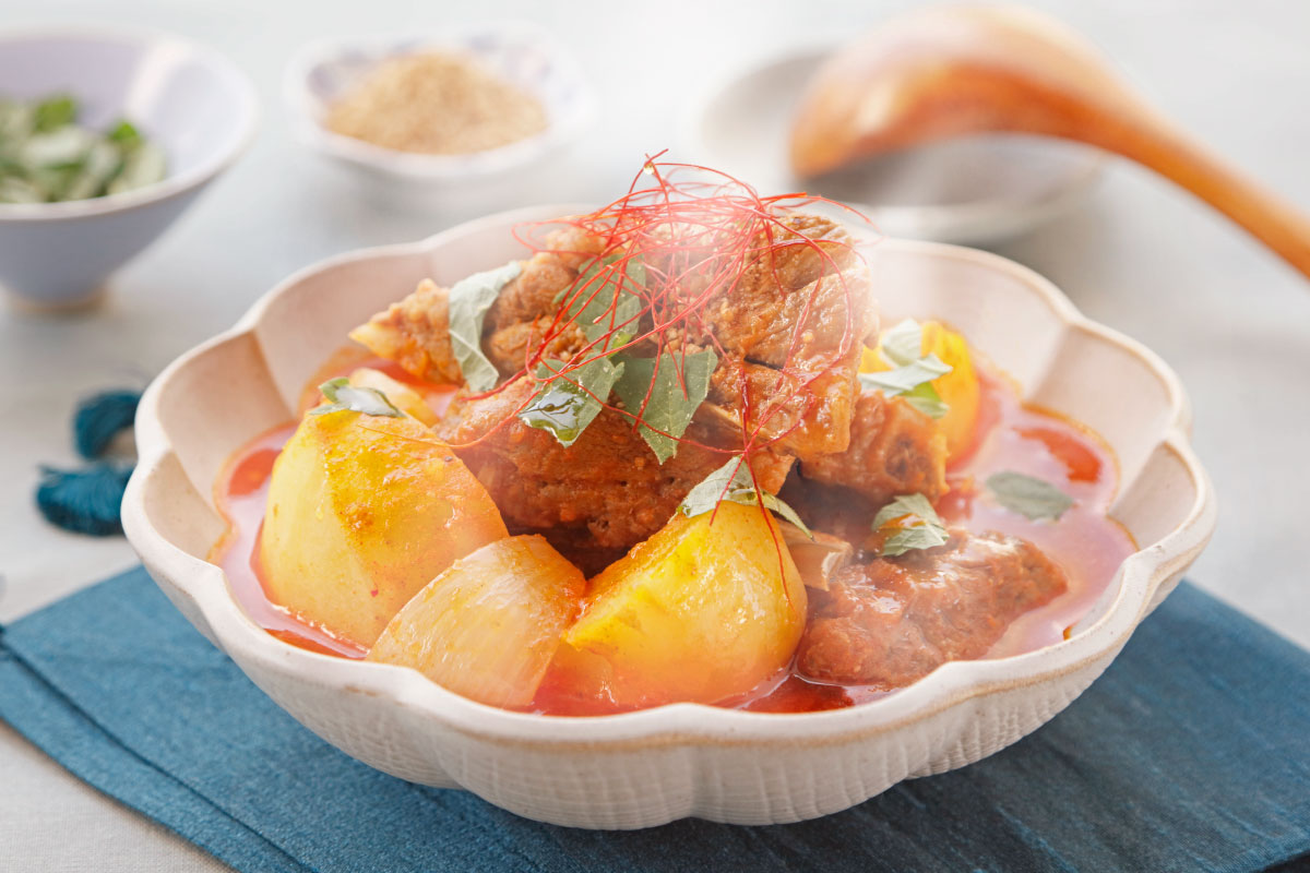 韓国のソウルフード「カムジャタン」は豚の骨付き肉とじゃがいもをほろほろになるまでじっくり煮込んだピリ辛の鍋です。大きめの具材が食べごたえ抜群!身体の芯から温まります。にんにくやえごまの葉の香りがきいて、ご飯にもお酒にもよく合う味わいです。