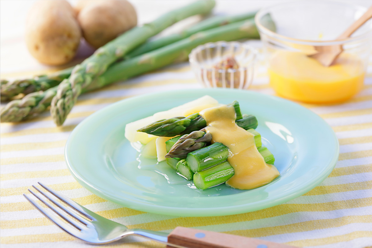 バターの風味とレモンの酸味がおいしいオランデーズソースをたっぷりかけてお召し上がりください。