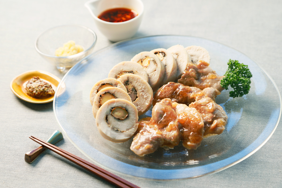 スモークチーズと黒胡椒がアクセントの鶏ハムと、煮こごりのタレをかけていただく鶏チャーシュー。