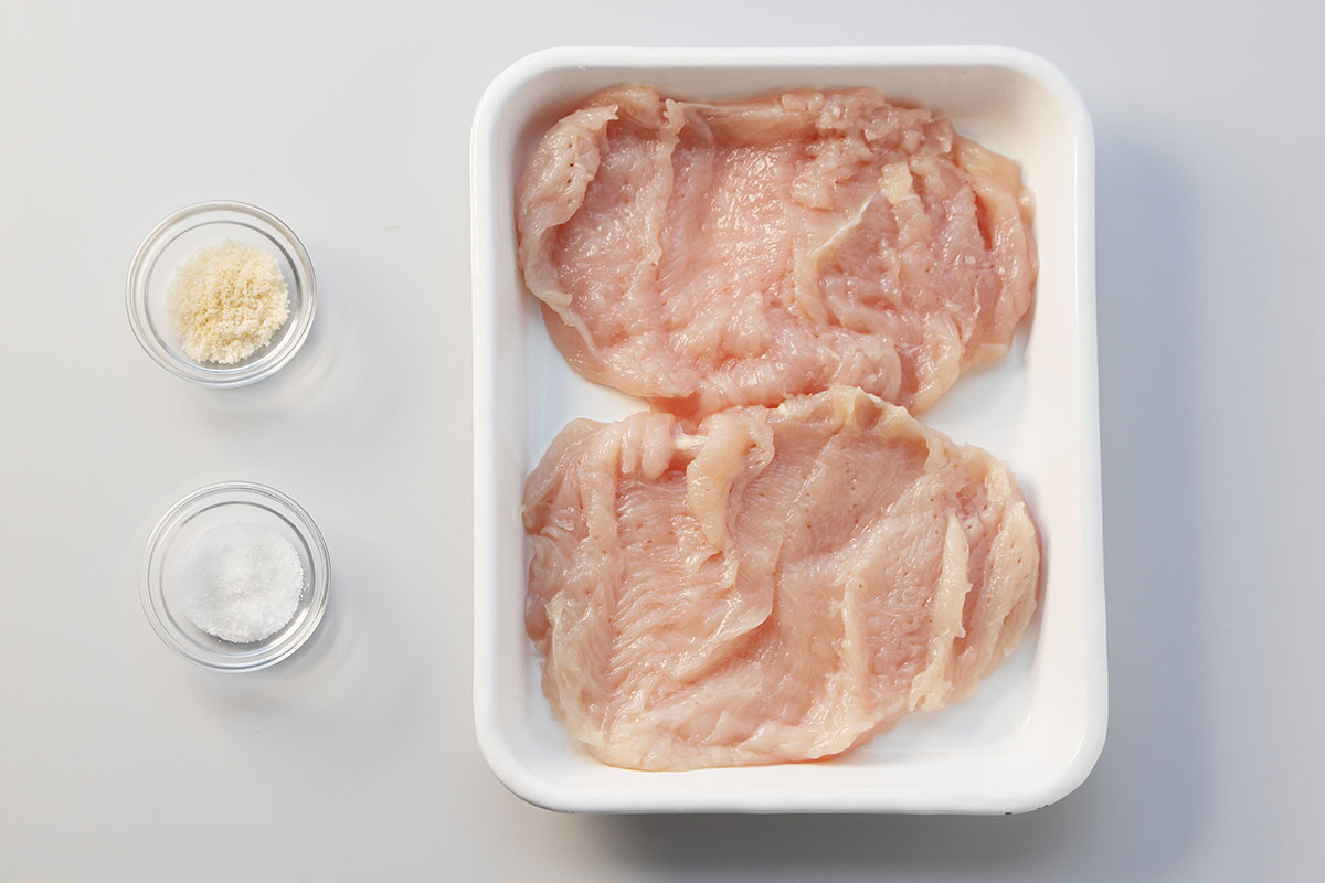 鶏むね肉は、皮を取り除き観音開きにして1cm程の厚さにする。フォークで刺して穴をあけ、砂糖と塩ををすり込んで密閉できる保存袋に入れ、冷蔵庫で20分おく。