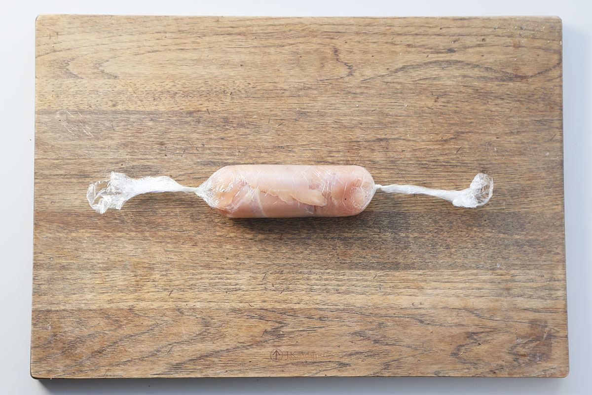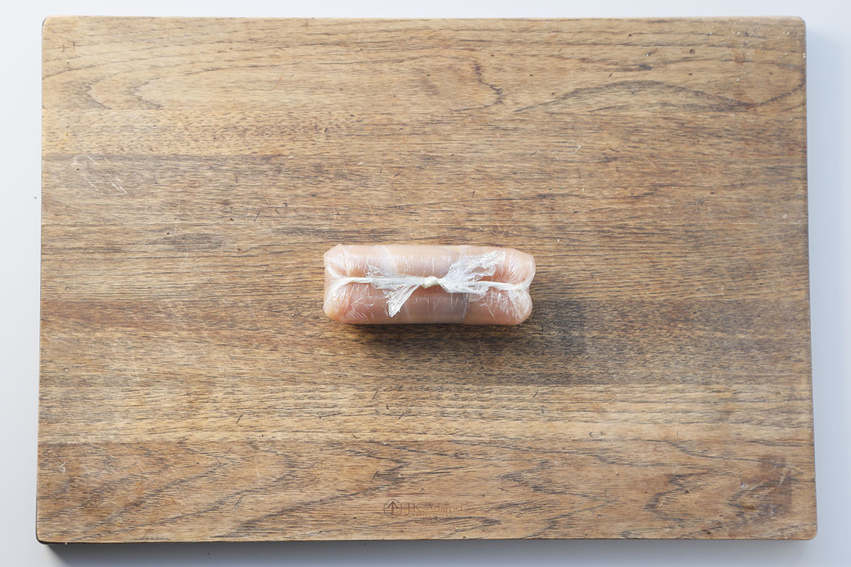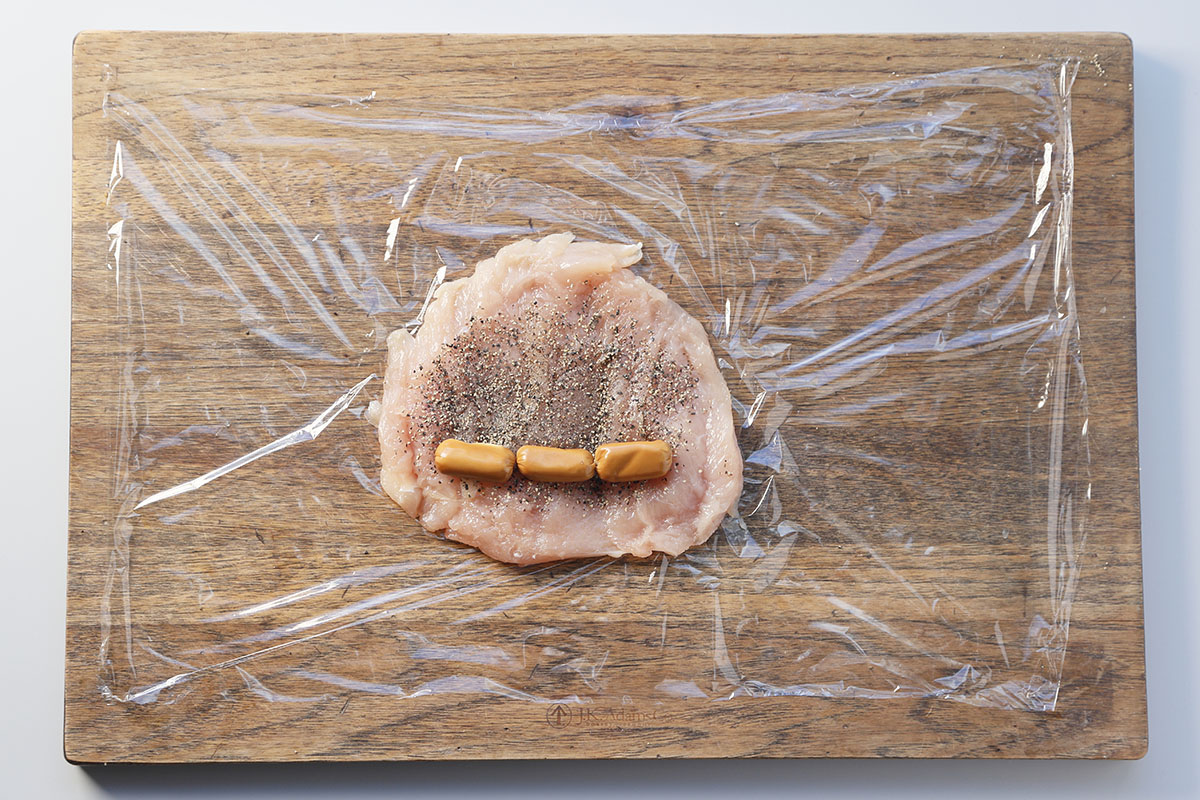 1を取り出して水気を拭く。ラップを大きめに広げて、手前に鶏肉をおき、粗挽き黒コショウ2gを一面にふる。肉の前側にスモークチーズを3個のせて手前からしっかりと巻く。ラップをぴっちりと巻きつけたら、ラップの両端をねじり、ねじった部分を中央で結ぶ。その上からもう一枚ラップをぴっちりと巻きつける。