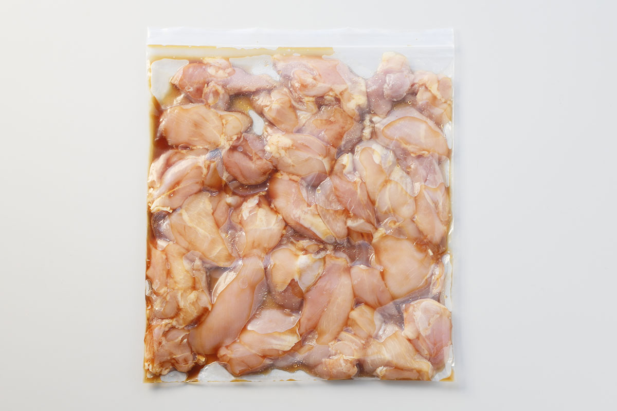 鶏もも肉は皮を取り除き、脂肪や血管なども丁寧に取り除く。食べやすいサイズに薄くスライスする。熱湯で湯せんができる保存袋に、スライスした鶏肉をなるべく平らに並べて入れ、残りの材料を混ぜ合わせて加え、空気を抜くように封をする。