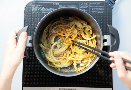 調理鍋にオリーブ油とバターを熱し、カレー粉と玉ねぎを入れて軽く炒める。