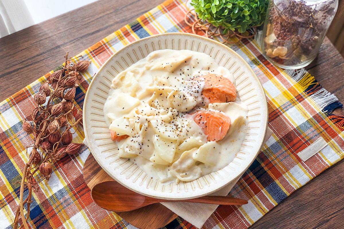 ・お好みで「ねぎ」や「玉ねぎ」を入れてもOK。その場合は、牛乳を少し多めに加えてください。ねぎを入れると味に甘みが増します。