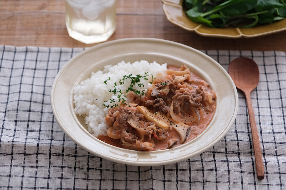 保温容器から調理鍋を取り出し、サワークリームを溶かし入れ、弱めの中火で3分煮る。器に温かいご飯とルーを盛り、刻みパセリと粗びき黒こしょうをトッピングする。