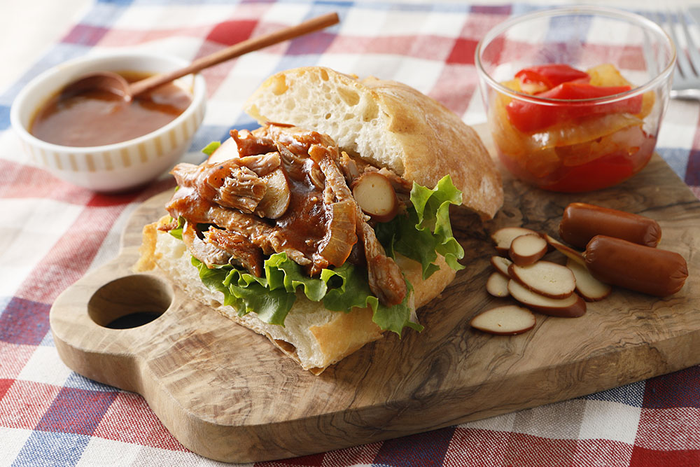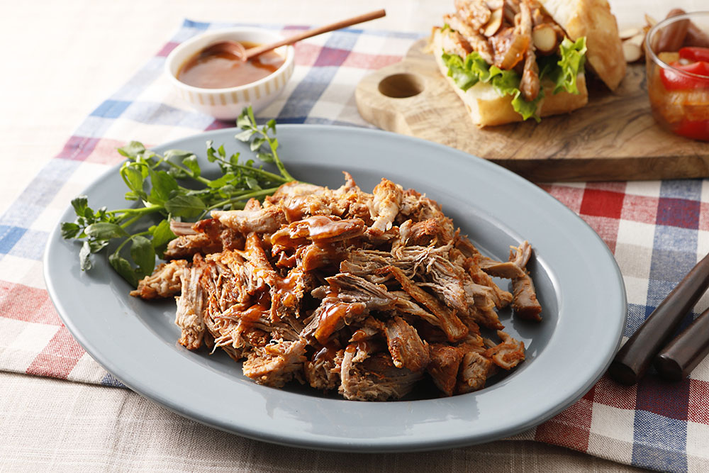 アメリカではメジャーな「プルドポーク」。プル「pull」は引っ張るの意味で、豚肉の塊を調理後に引っ張ってバラバラにほぐすこと。これをパンにサンドしたり、サラダに載せたりします。煮込んだスープはソースにします。
