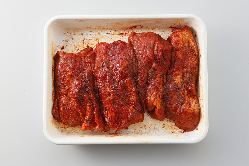 豚肉は肉の繊維に沿って縦に2等分して、下味が入りやすいようにフォークで満遍なく刺す。バットに豚肉を並べ表面にAを擦り込み、ラップをして冷蔵庫で1時間おく。所定の時間が経過したら、常温に戻しておく。