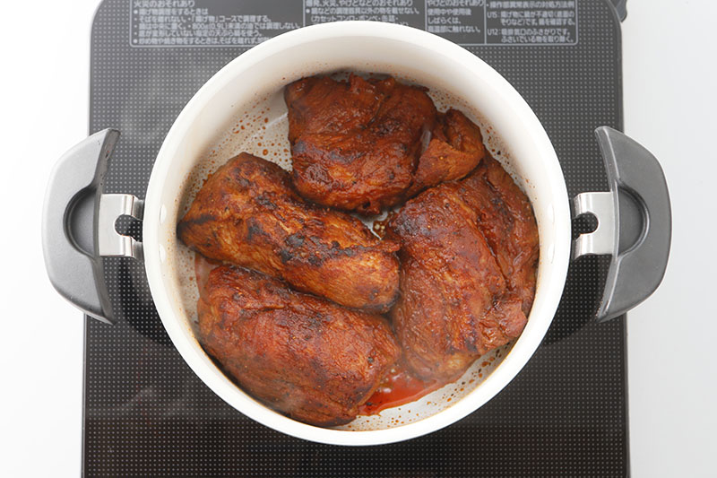 調理鍋にサラダ油を熱して1の豚肉を入れ、全面に焼き色をつけて取り出す。