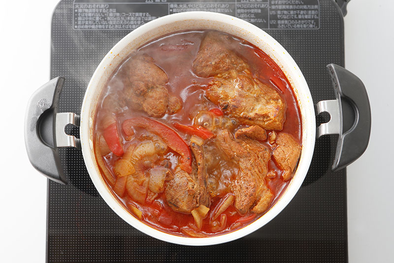 調理鍋に1の玉ねぎとパプリカを敷き、豚肉を戻し入れてBを加えて加熱する。沸とうしたらあくを取り、火を弱め、フタをして15分加熱する。