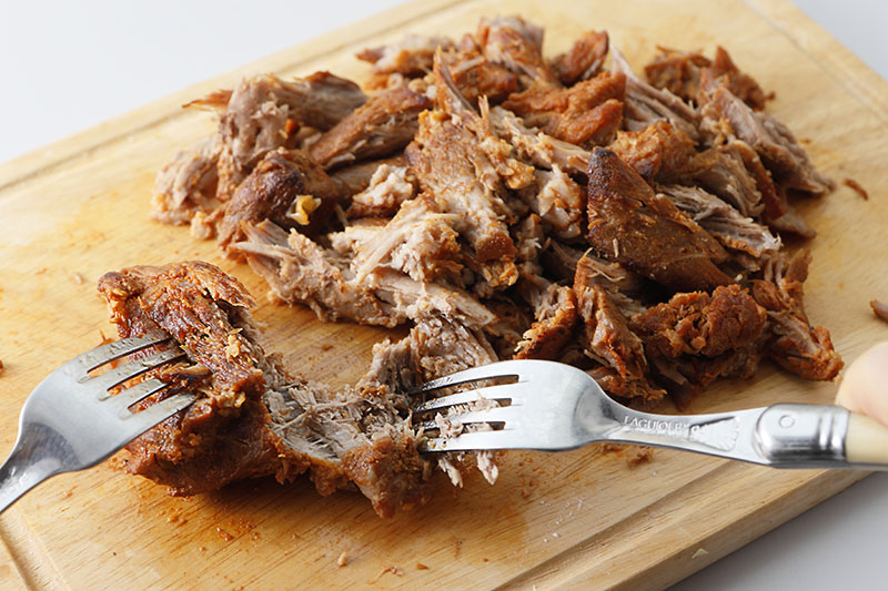 所定の時間が経過したら、豚肉を取り出しフォークを2本使って肉の繊維に沿って引っ張ってほぐす。
