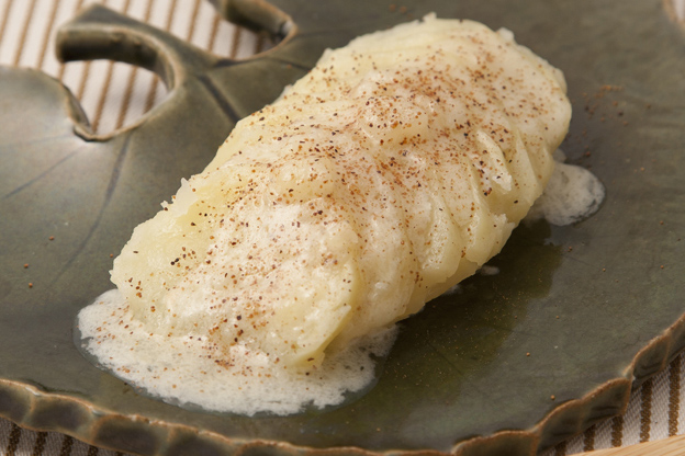 薄切りにしたじゃがいもを重ねて蒸し焼きに、ホクホクしたじゃがいもと生クリームの相性抜群。