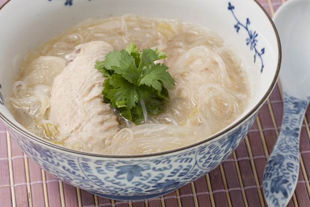 手羽先と材料を入れて煮込むだけのスープ。春雨は乾燥のまま保温調理で仕上げます。
