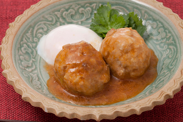 少し濃いめの味つけにしたナンプラー風味の肉団子。温泉卵に絡めて食べるとまろやかな味わいです。