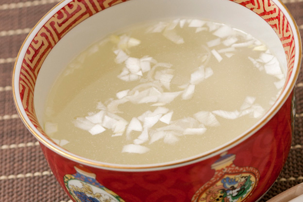 洗った調理鍋に分量の水、酒、長葱、生姜の薄切り、鶏ガラを入れ火にかける。沸騰したら弱火にしてアクを取り、フタをしないで弱火のまま10分加熱。