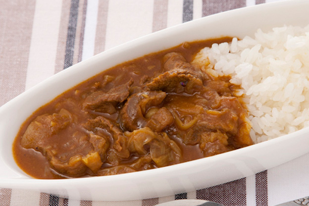 調理鍋にサラダ油・バターを入れ、千切りにした玉ねぎ・しょうが・にんにくを加え、玉ねぎが少し茶色になるまで中弱火で炒める。