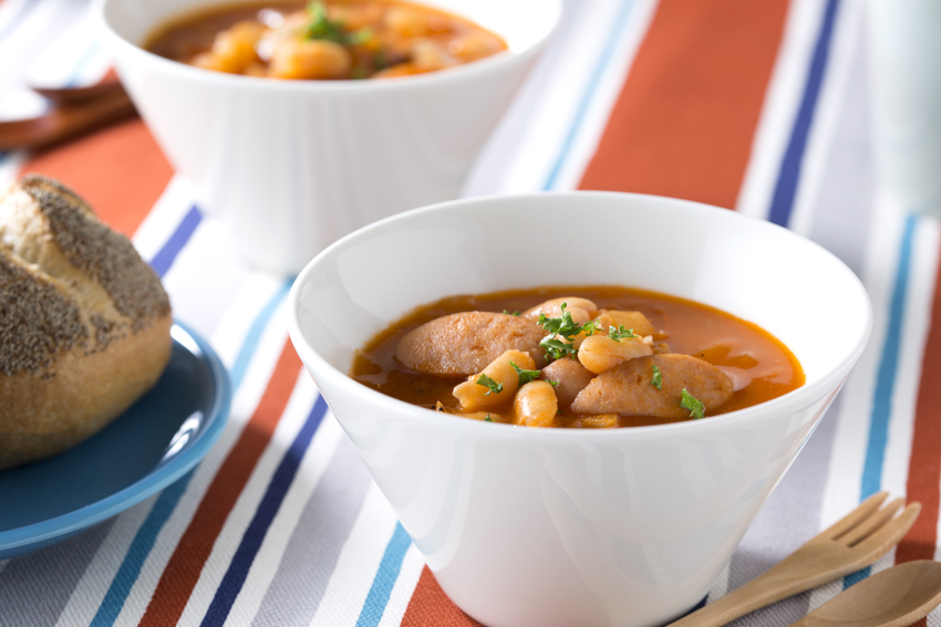 調理鍋を熱し、オリーブ油、にんにく、玉ねぎを入れて焦がさないように炒め、ソーセージ、豆の順に加えて軽く炒め合わせる。白ワインを入れて煮立て、トマトジュース、水、調味料を加えて中火で5分煮る。